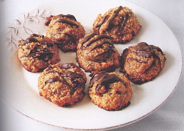 DIRECTIONS: Preheat the oven to 350 degrees and grease two 13 x 9 in cookie sheets. • In a large bowl, thoroughly mix the coconut, flour, egg yolks, brown sugar, salt, butter and vanilla together into a dough. • Divide the dough into 24 uniform balls, place on greased cookie sheets, and bake for about 35 minutes until golden. • Remove from the oven and let cool. • Melt the chocolate chips in a double boiler and drizzle on top of the cookies. • For extra crunchiness, add finely chopped walnuts or pecans to the cookie batter. • For extra sweetness, drizzle some caramel on top as well.